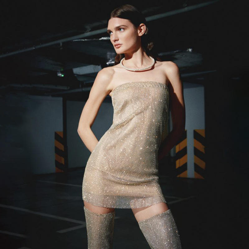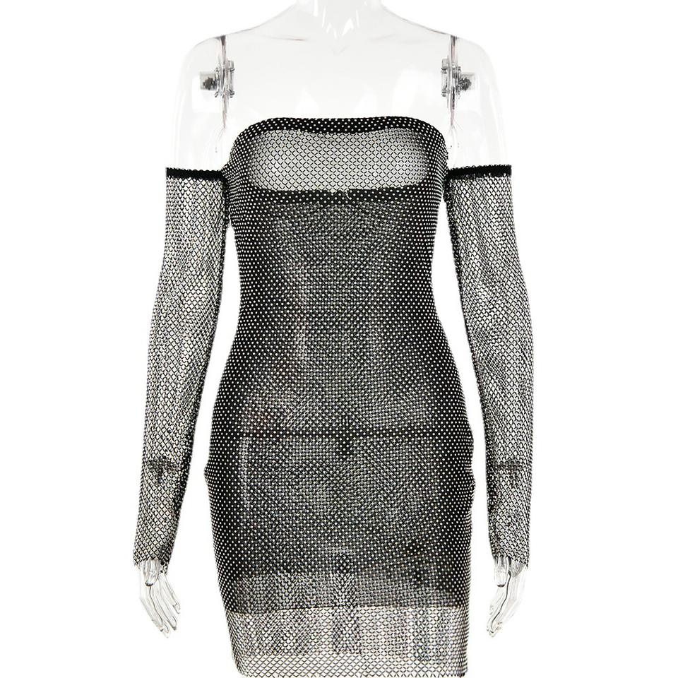 Vestido Corto Ajustado con Pedrería y Hombros Descubiertos, Vestido de Noche Translúcido, Moda Femenina