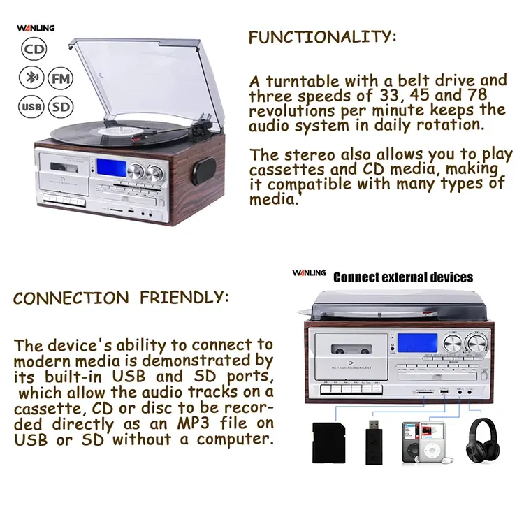 Fonógrafo antiguo, gramófono, reproductor de discos RCA, reproducción de CD/grabadora de cinta