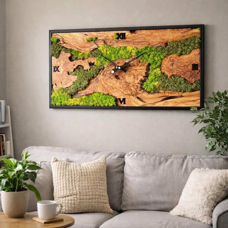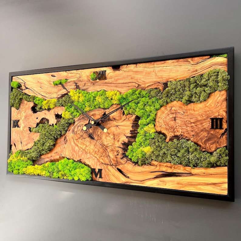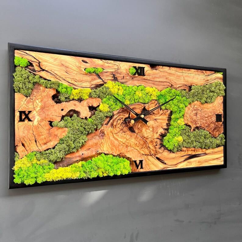 Reloj de Pared Rectangular de Madera de Olivo y Musgo, Hecho a Mano, Decoración de Lujo, Ecológico
