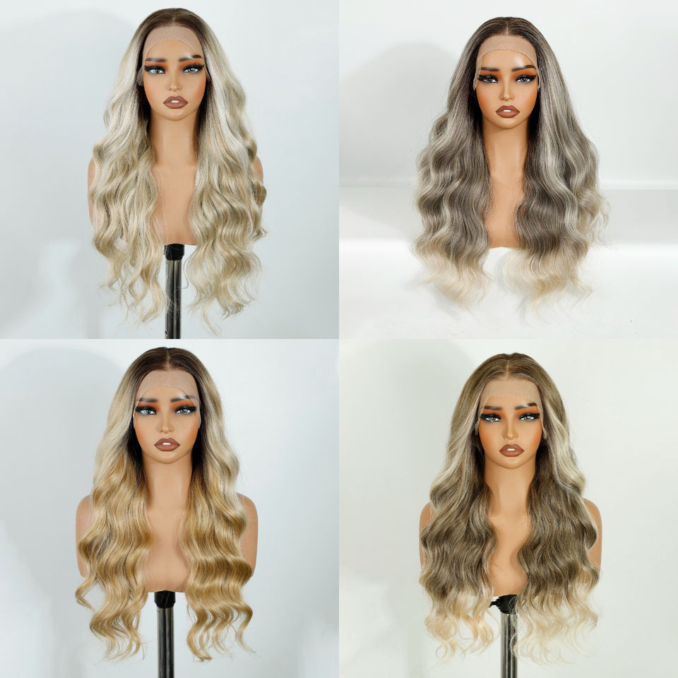 Ombre Color HD encaje frontal pelo sintético cuerpo ondulado peluca larga fibra resistente al calor sin llama HD encaje Glueless pelo peluca sintética