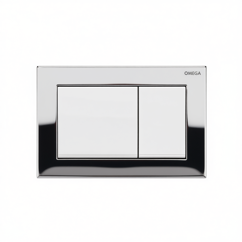 Placa de Control Omega 20 Cuadrada de 2 Botones, Acabado Cromado Satinado con Borde Inferior Cromado