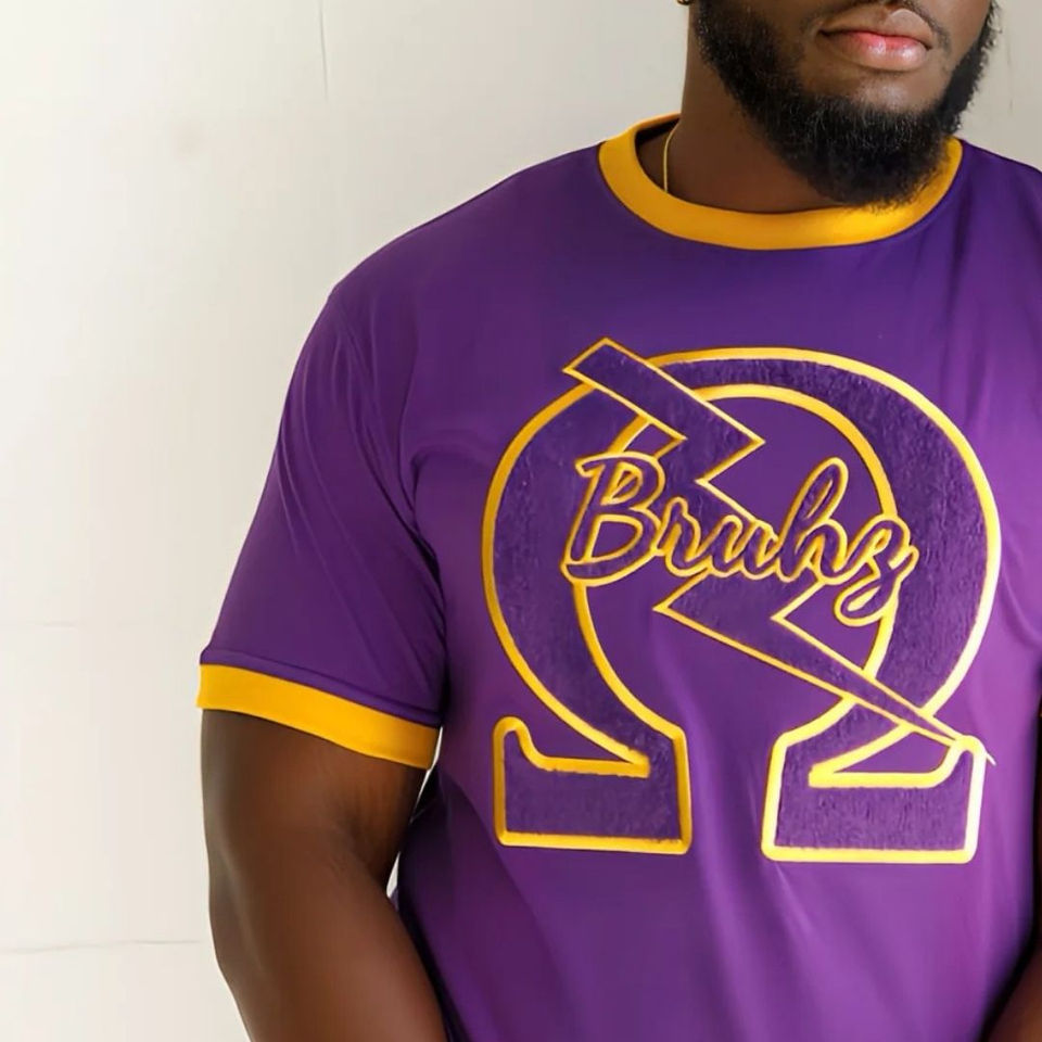Camiseta de Algodón con Bordado de Chenilla Personalizada de la Fraternidad Greek Life, Modelo Omega Bruhz Purple Chenille Ringer Tee, Venta al por Mayor