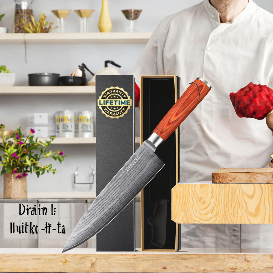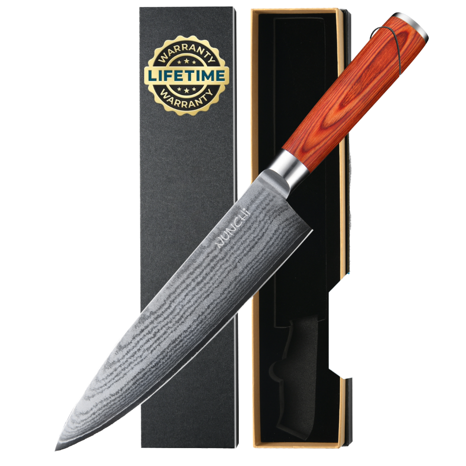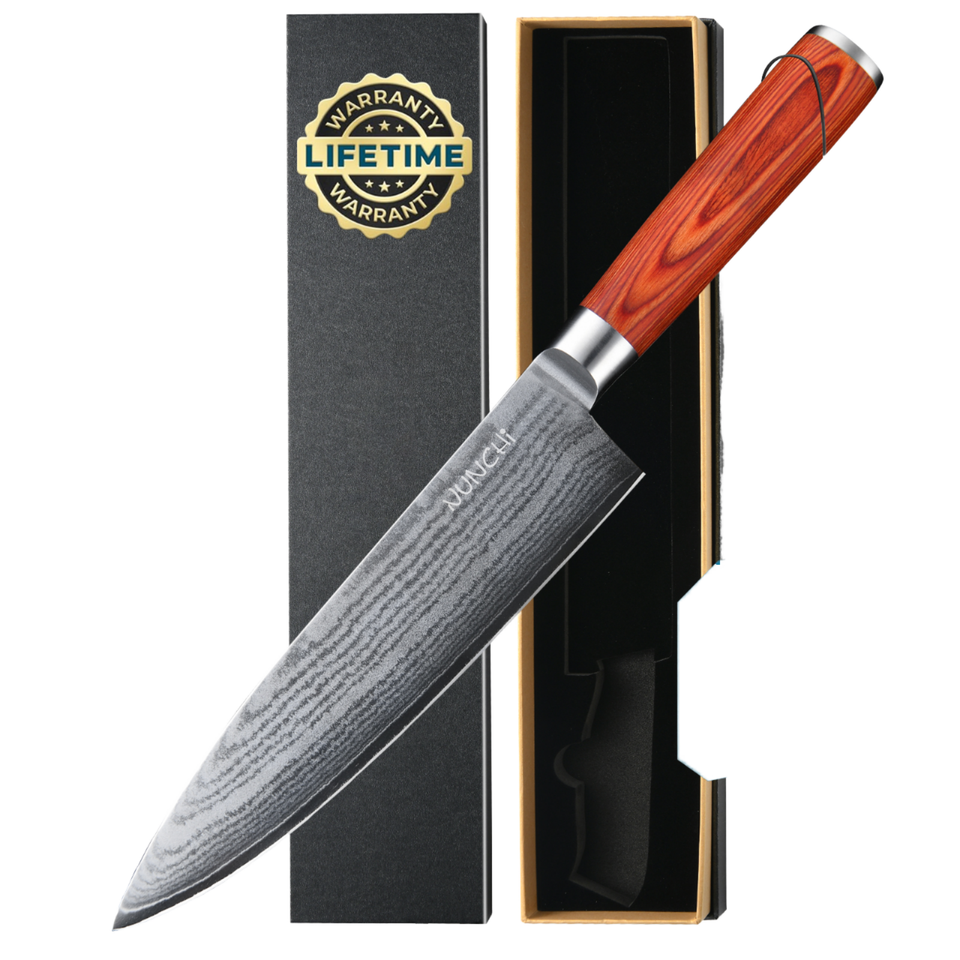 Cuchillo de Chef Forjado de Acero al Carbono Ultra Afilado de 8 Pulgadas con Mango de Madera Roja, Diseño Ambidiestro