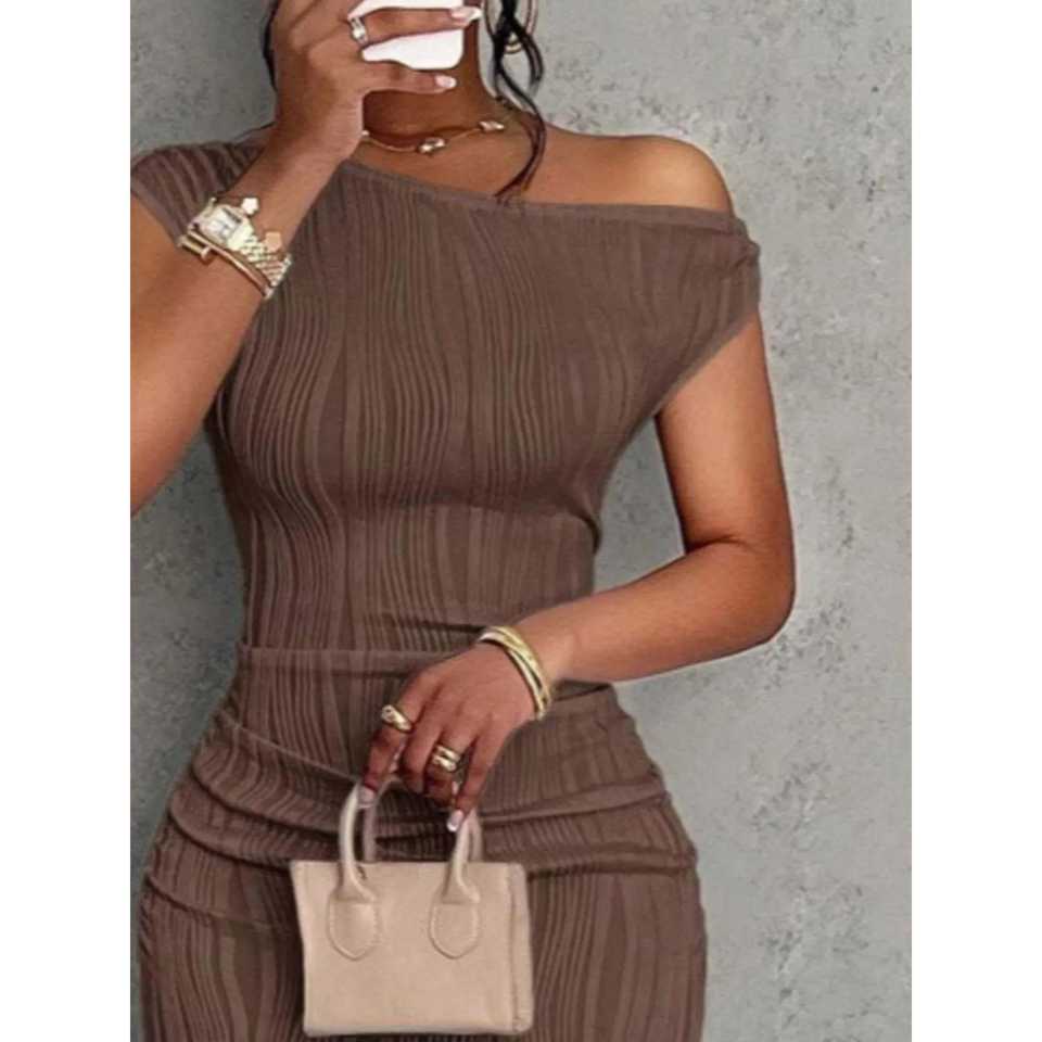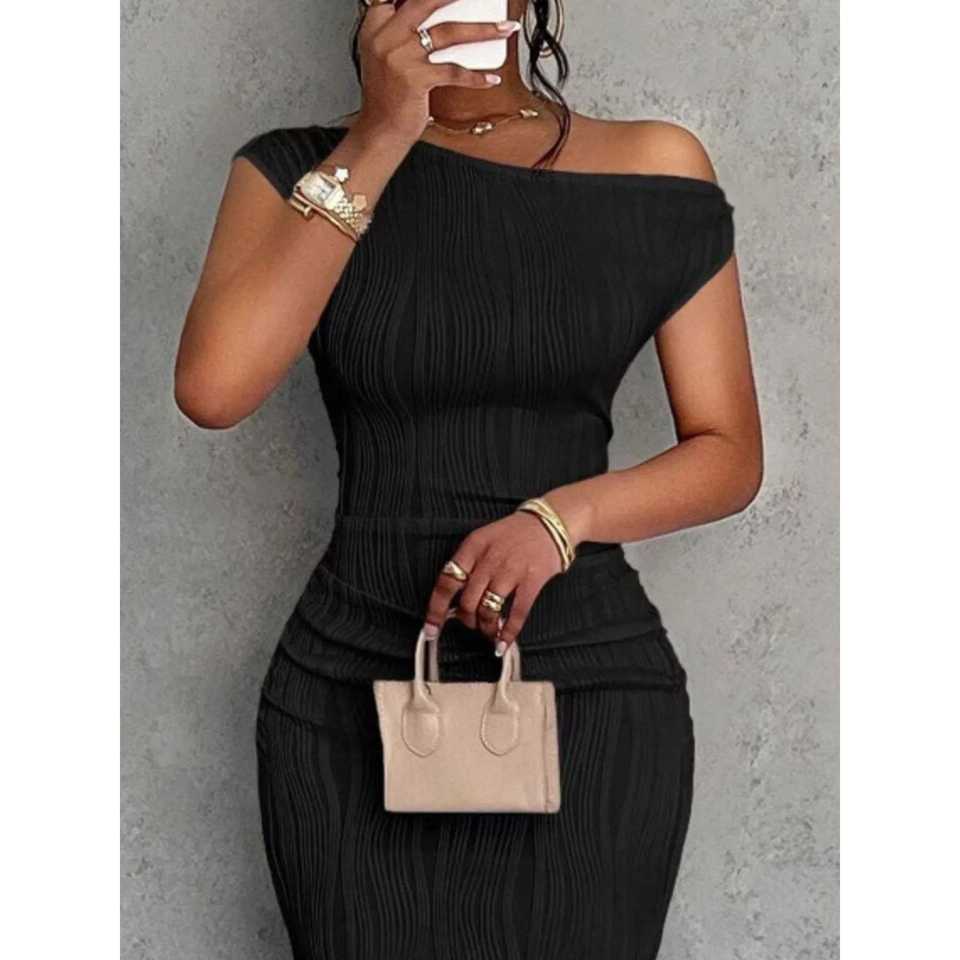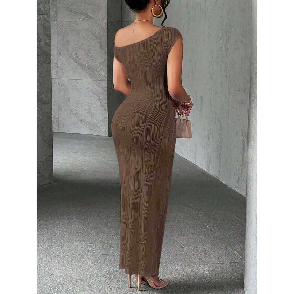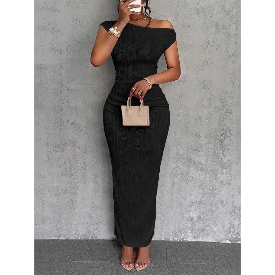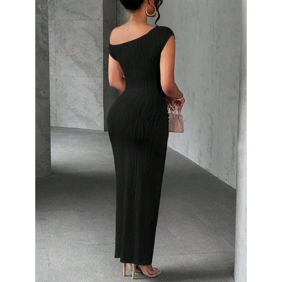 Vestido Maxi Ajustado de Un Solo Hombro con Textura y Cintura Natural, Transpirable