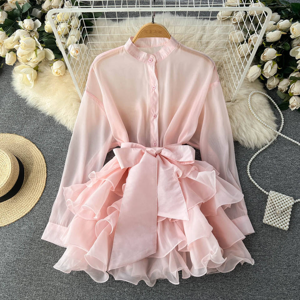 Blusa de Chifón Sólido de Talla Única con Botones, Casual, para Fiesta, Otoño, Ecológica, Transpirable, con Borde de Volantes y Lazo de Alta Calidad para Mujer