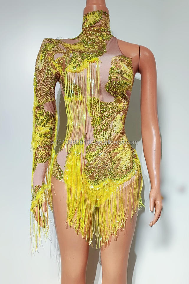 Traje de actuación de anillo colgante de una pieza con borla apretada y sexy de cuello alto de malla de diamante completo de una manga