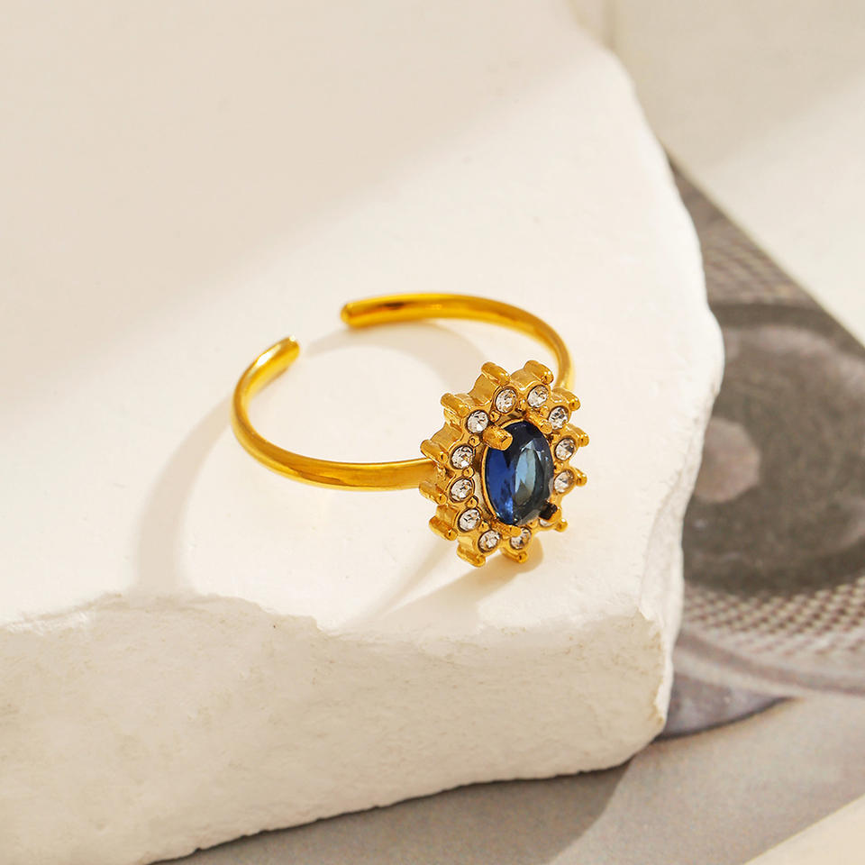 Anillo Abierto con Forma de Flor, Zirconia Azul, Chapado en Oro de 18k, Acero de Titanio, Joyería para Mujer para Fiestas