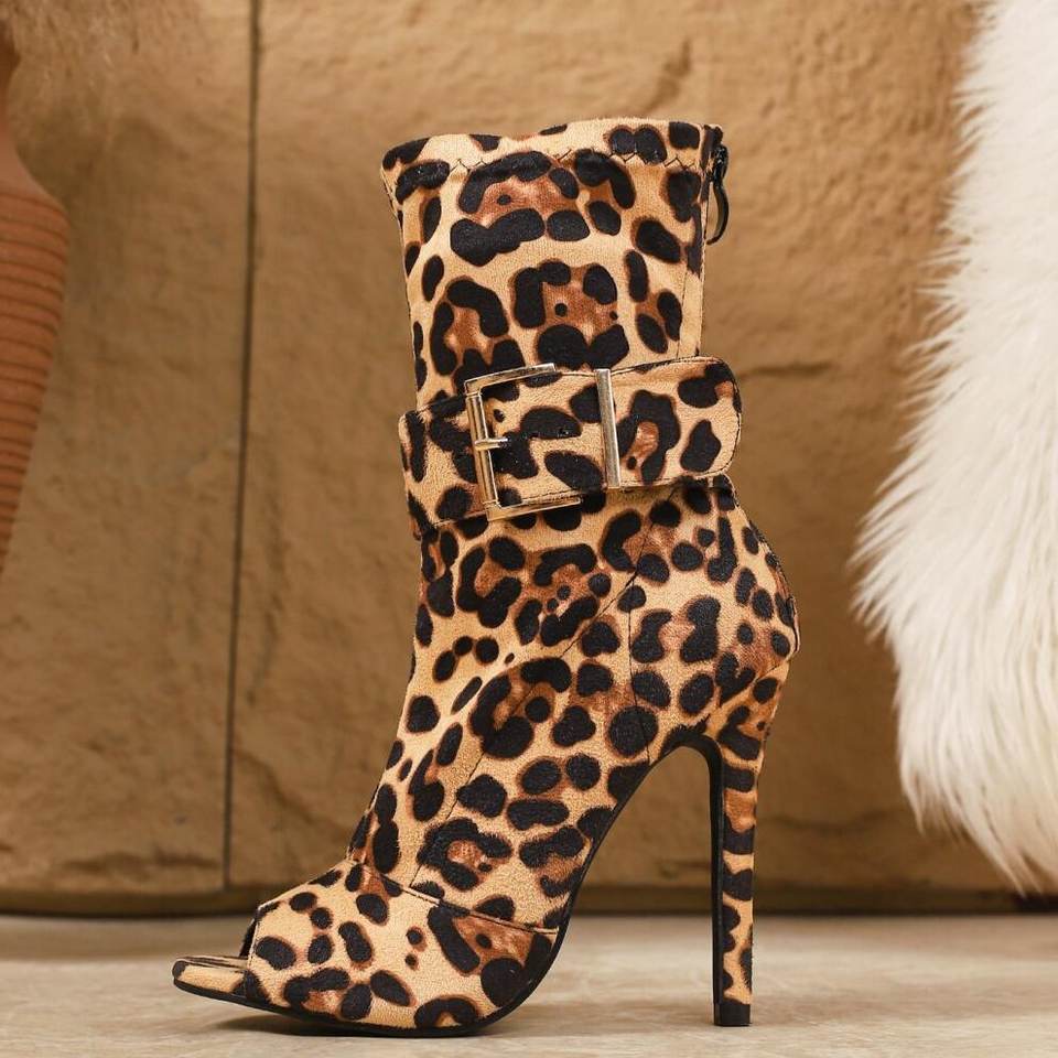 Sandalias de tacón de aguja con punta abierta y estampado de leopardo, con hebilla grande de 11 cm, botines cortos de tacón alto de moda para mujer