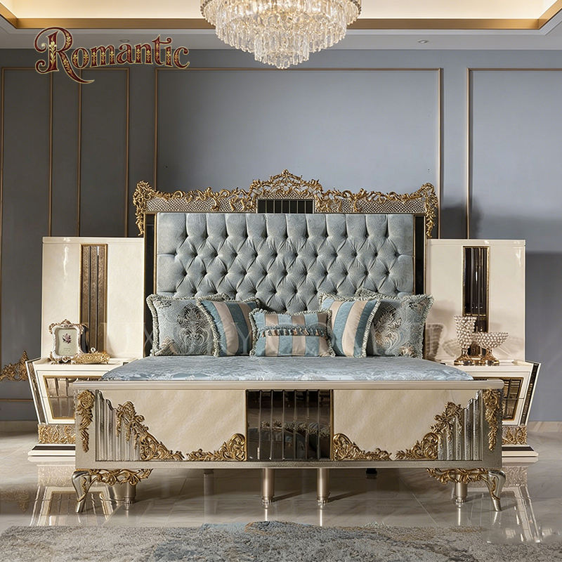Opulento Juego de Cama Barroco Turco con Incrustaciones de Espejo, Mesitas de Noche Tapizadas en Beige y Dorado Incluidas, Muebles de Dormitorio de Lujo