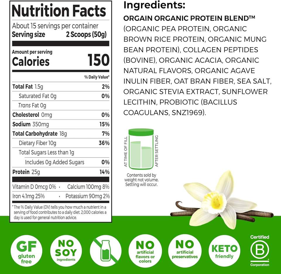 Proteína Orgain en Polvo + Colágeno, Tipo I y III de Vainilla, Probióticos 1B CFU, Favorece la Salud del Cabello, la Piel y las Uñas, 1.6 lb