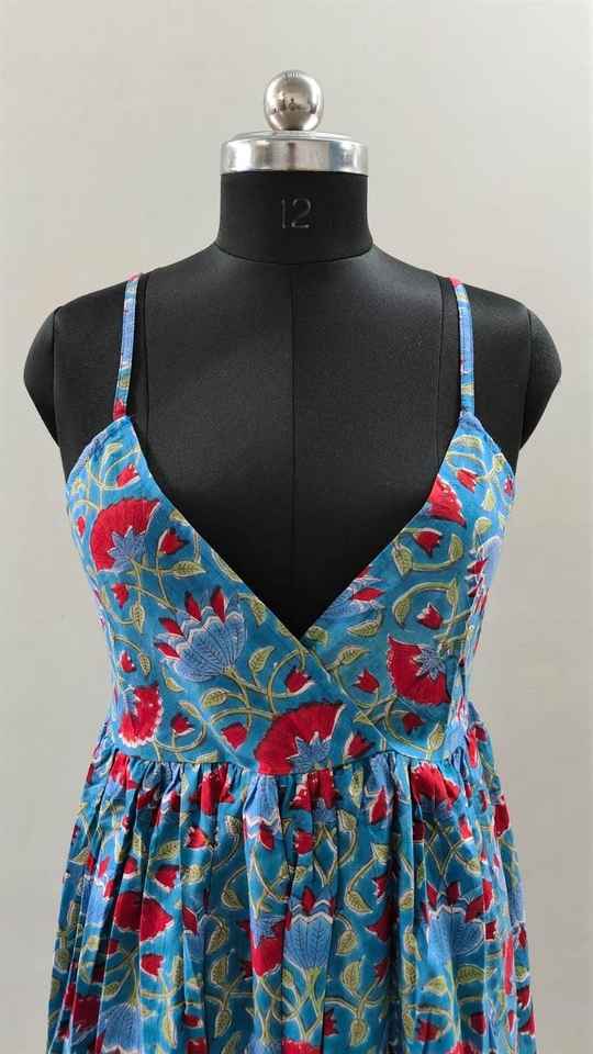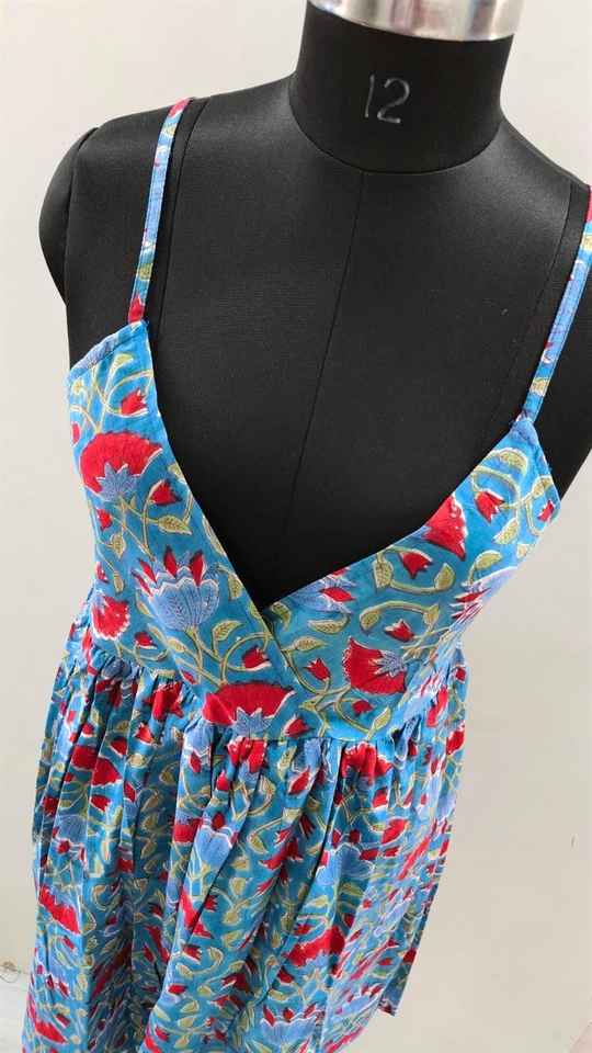 Vestido de mujer con estampado de bloques de algodón orgánico Vestido corto hecho a mano con diseño floral Ligero Ropa de día Beach Cover Up