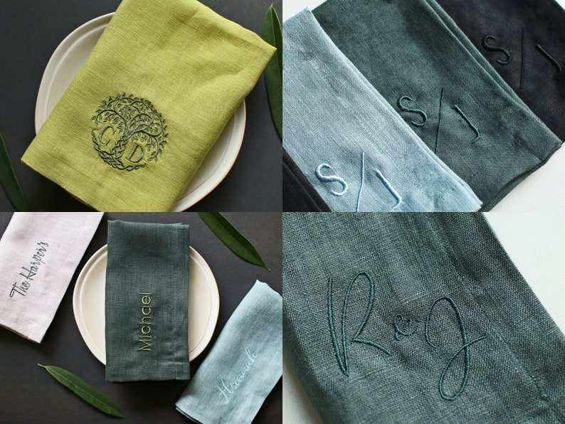 Servilletas bordadas hechas a mano de lino orgánico con forma cuadrada de monograma personalizado para ocasiones especiales de aniversario de boda