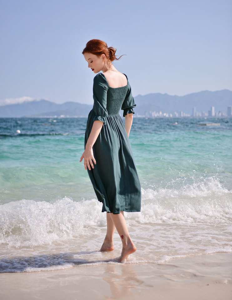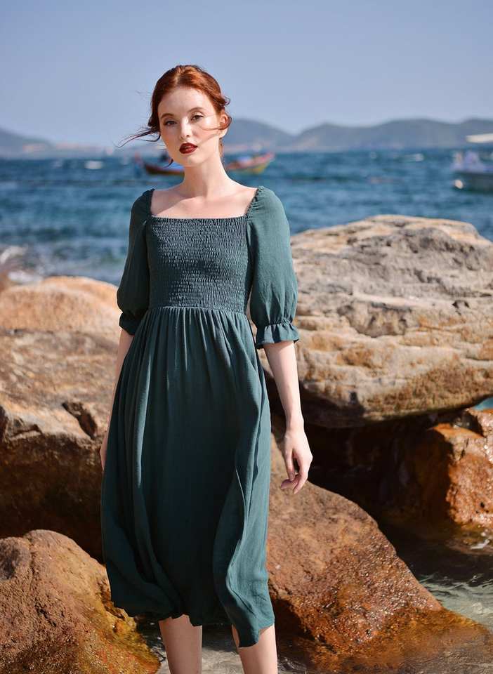 Vestido orgánico de lino Midi con hombros descubiertos para mujer Ropa de verano de tela natural cómoda y elegante