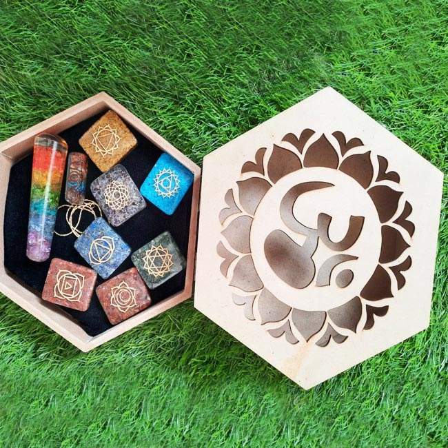 Orgonita Chakra Set:Orgonite Chakra Set con caja de regalo de madera Kit