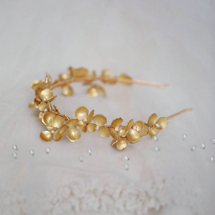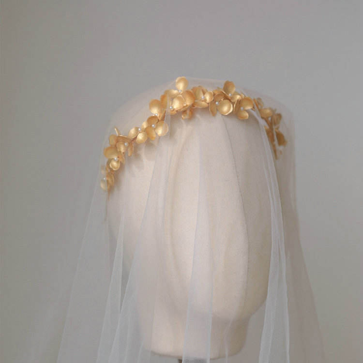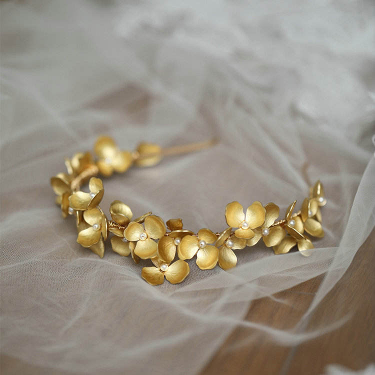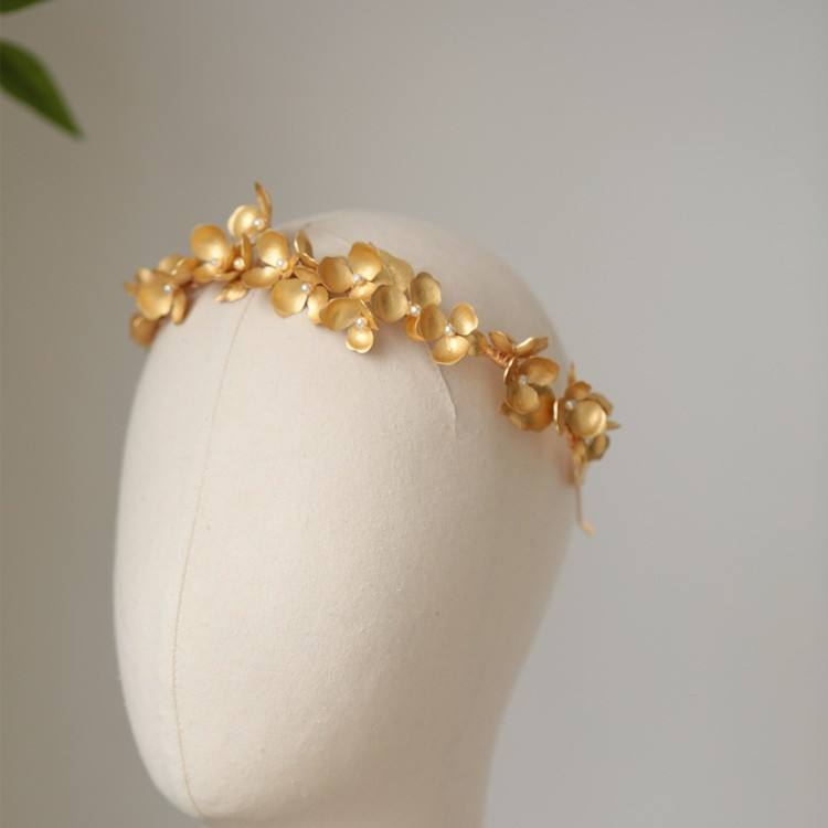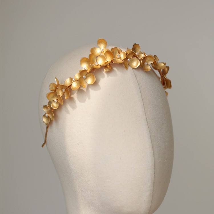 Tocado de Novia Retro de Diseño Original y Alta Calidad, Hecho a Mano con Perlas, Chapado en Oro, con Flores de Cobre, Tiara de Novia para Mujer