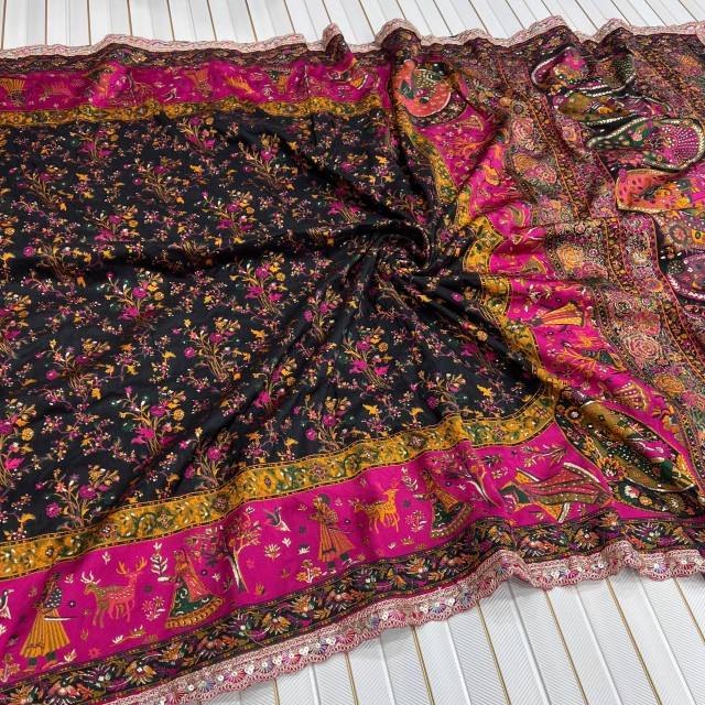 Sari Original de Seda Pashmina con Tejido Zari en Toda la Superficie, con Bordado de Hilos Multicolores y Encaje con Secuencia de Codificación en el Borde
