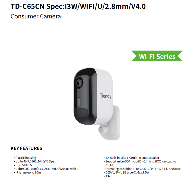 Cámara Wifi Tiandy Original de 4MP TD-C65CN con Micrófono Incorporado
