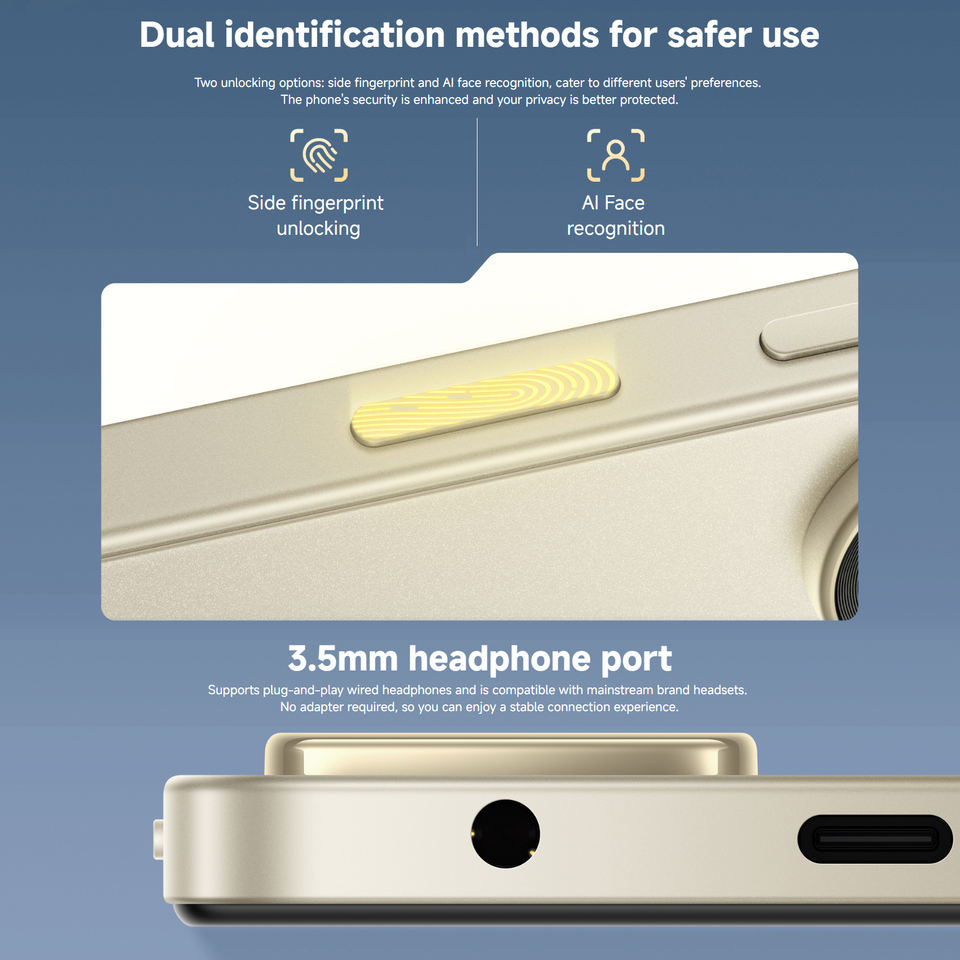 Seguridad:Sensor de huella lateral, desbloqueo facial con IA