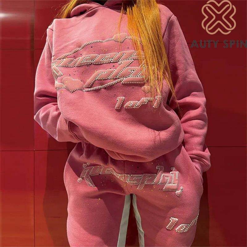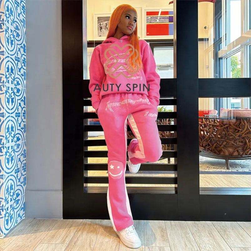 Sudadera recortada con capucha y logotipo personalizado OEM, conjunto de 2 piezas para correr, ropa de calle de gran tamaño para mujer, conjunto de pantalones de chándal con cuello y capucha