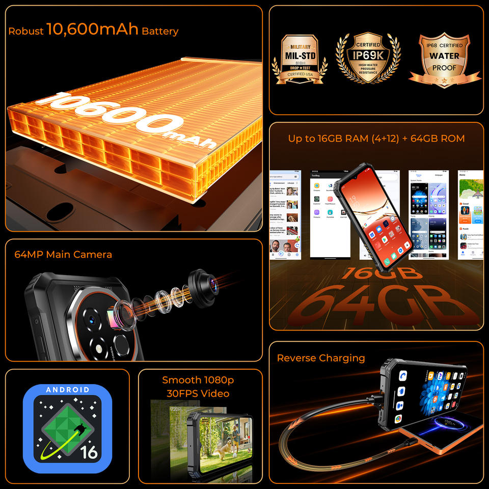 Teléfono Resistente Oukitel G6, Económico, Batería de Gran Capacidad de 10600 mAh, 90 Hz, 4+64 GB, Android 16, 4G, Smartphone de 6.52 Pulgadas