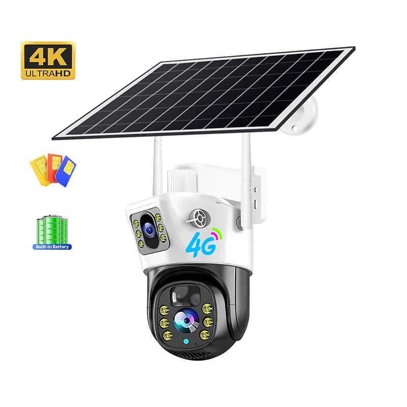 Al Aire Libre 4K 4G/GSM 8MP Lente dual Wifi inalámbrico IP Seguridad CCTV Cámara de vigilancia con energía solar con tarjeta Sim