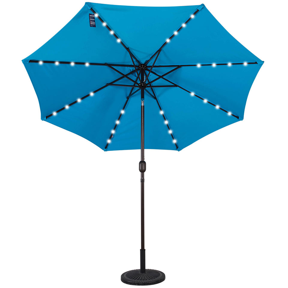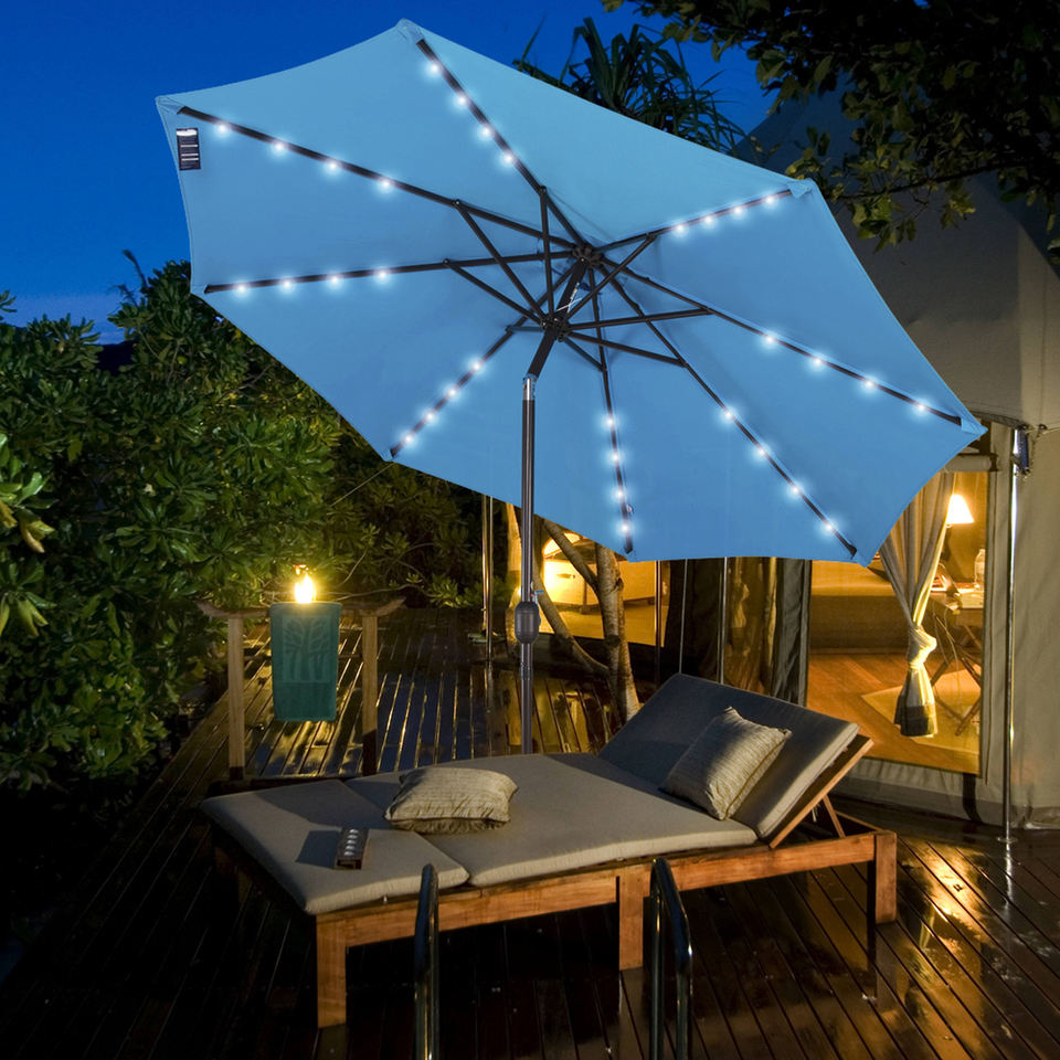 Panel Solar de 9 pies para exteriores, cargador de sombrilla, paraguas iluminado de 32 LED para Patio, mesa de mercado, sombrilla de jardin con inclinación