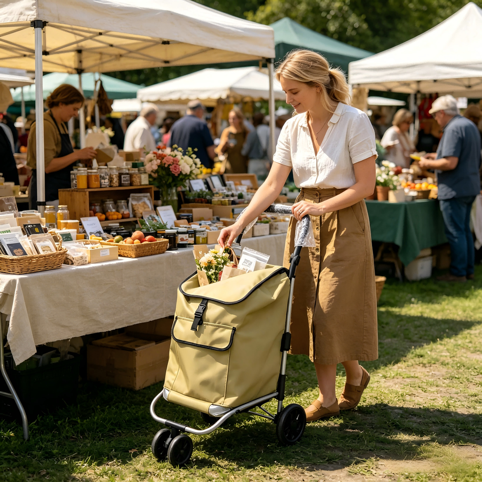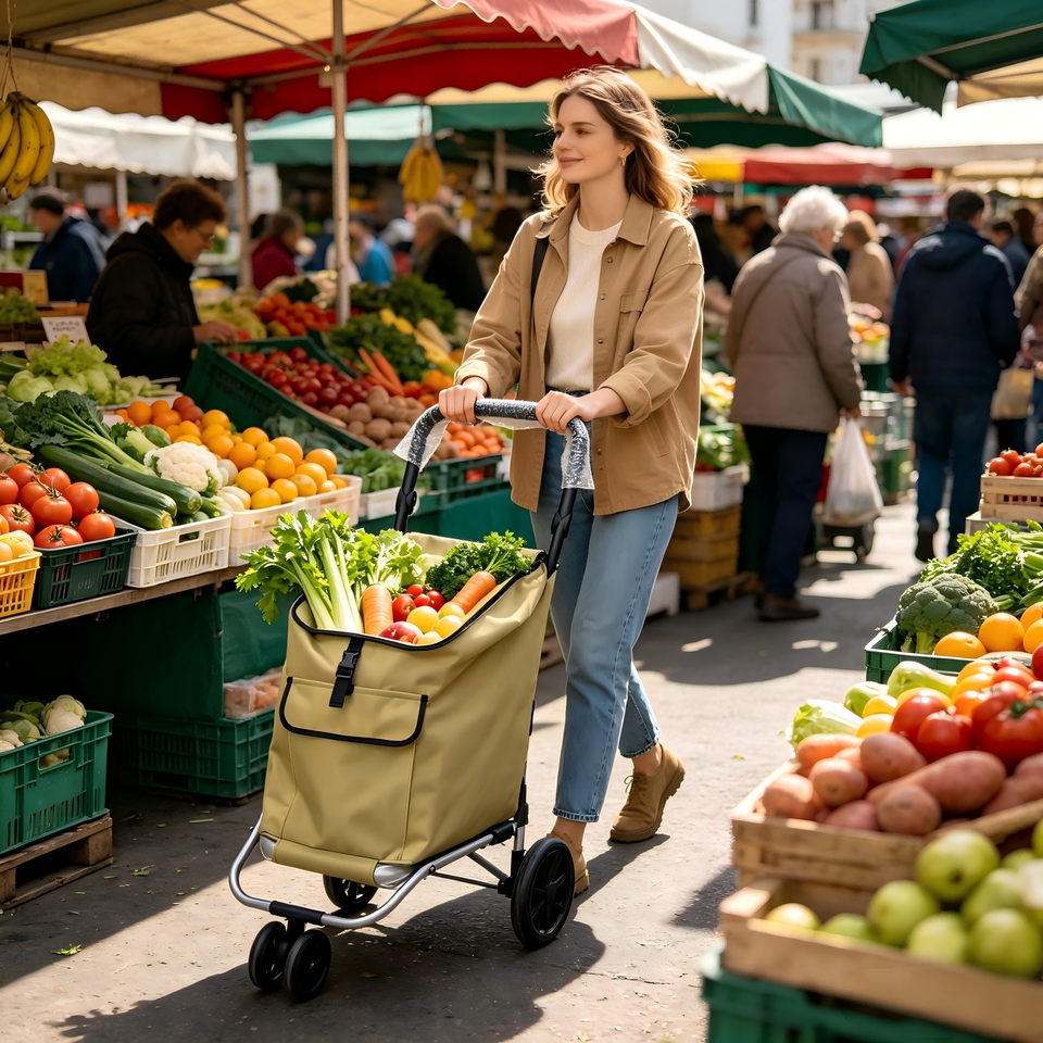 Carrito de Compras Plegable de Tela Personalizable para Exteriores, Carrito de Compras Ligero con Doble Cesta para Almacenamiento de Verduras y Comestibles