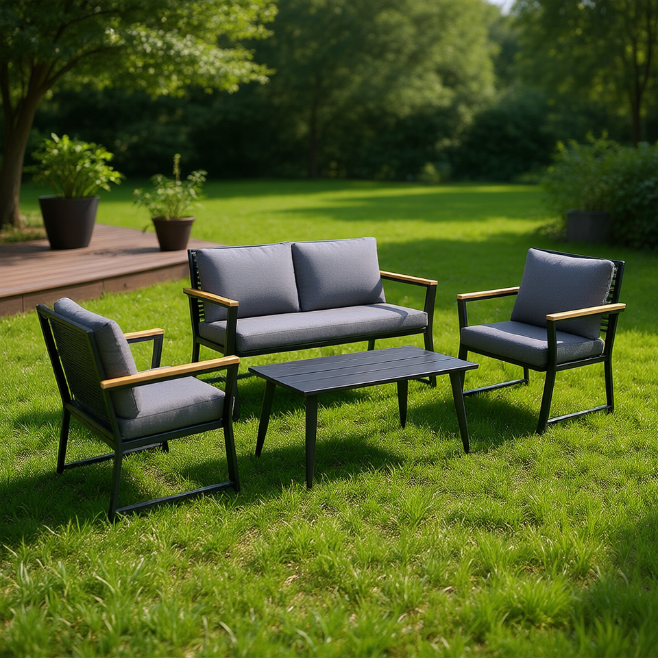 Conjunto de Muebles de Jardín con Sofá, Dos Sillas y Mesa de Centro, Estructura de Acero Negro, Reposabrazos de Madera de Teca, Diseño Contemporáneo, Resistente a la Intemperie