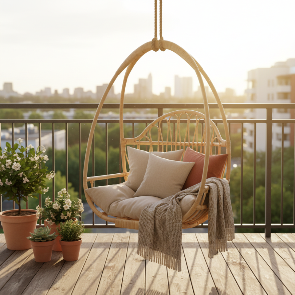 Silla Colgante de Mimbre para Exteriores, Silla Columpio de Ratán con Cojín, Muebles para Jardín, Patio, Balcón, Dormitorio, Diseño Rústico, Duradero