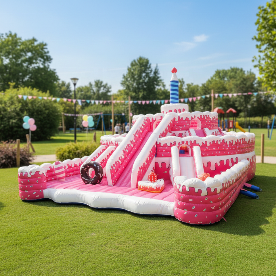 Castillo Inflable Grande Rosa para Exteriores, Combinación de Tobogán y Escalada, Castillo Hinchable con Diseño de Pastel Personalizado