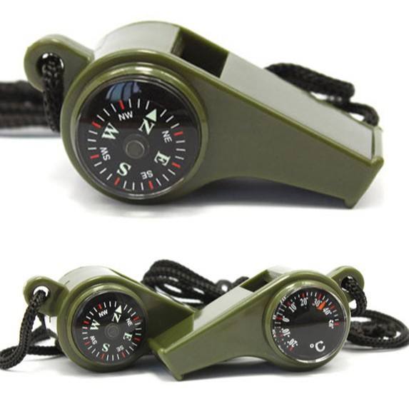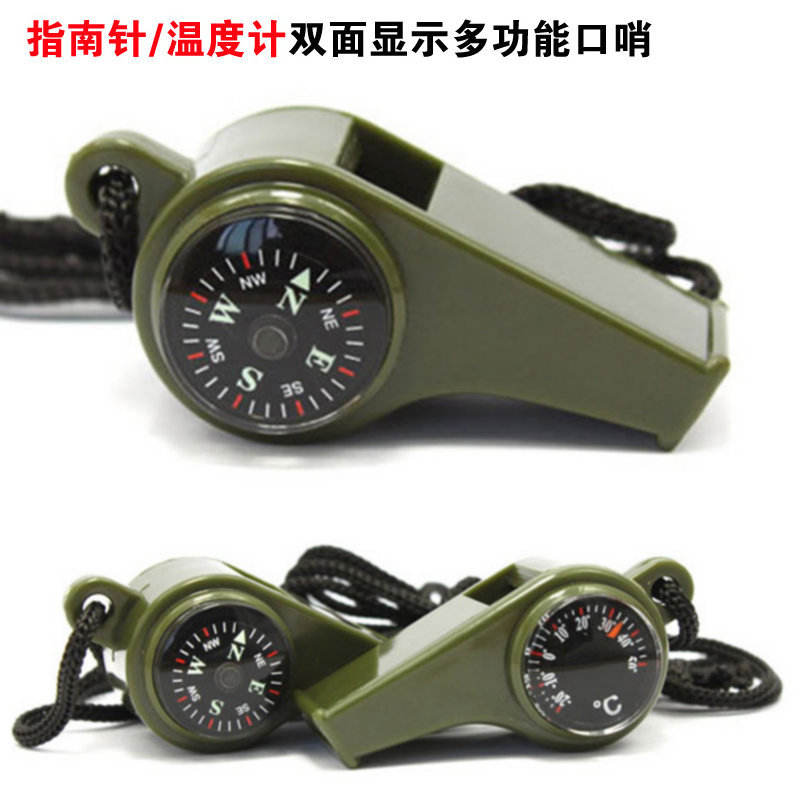 Silbato de plástico 3 en 1 para exteriores con brújula y termómetro, equipo de supervivencia compacto para senderismo, camping y rescate.