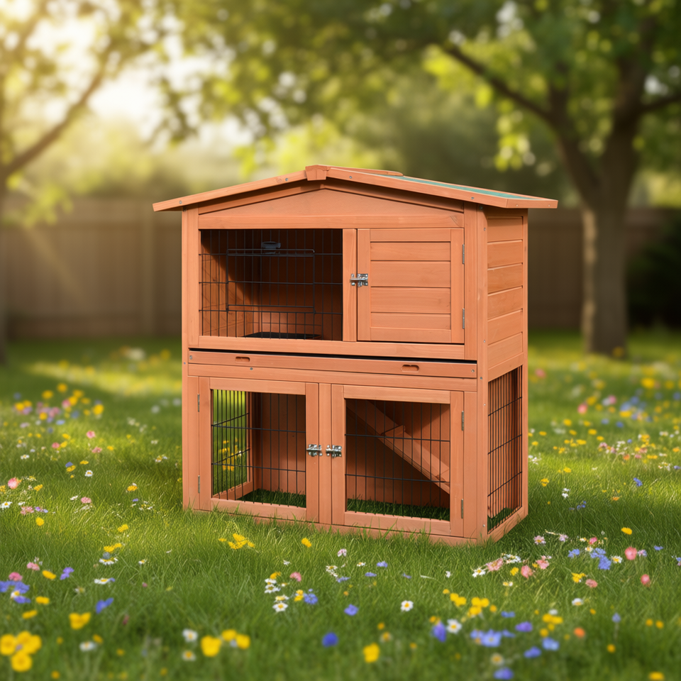 Conejera de Madera para Exteriores con Bandeja Impermeable, Rampa y Techo Resistente a la Intemperie, Modelo D0100X3H24X, Jaula Natural para Conejos