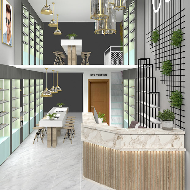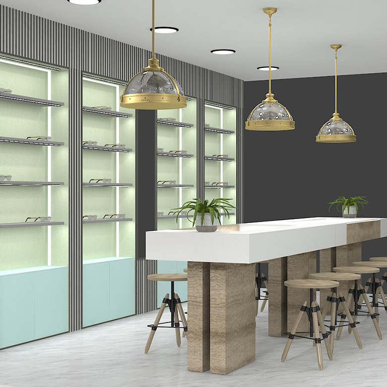 Estante de metal de diseño personalizado, escritorio de recepción, tienda óptica al aire libre, escaparate de toda la tienda para anteojos, gafas de sol, ópticamente para