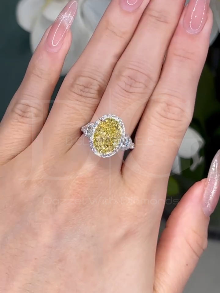 Oval Fancy Yellow 7.40tcw Moissanite Halo Anillo de compromiso | IGI Certified-Claridad de oro rosa de 14K, boda chapada en plata de 14K