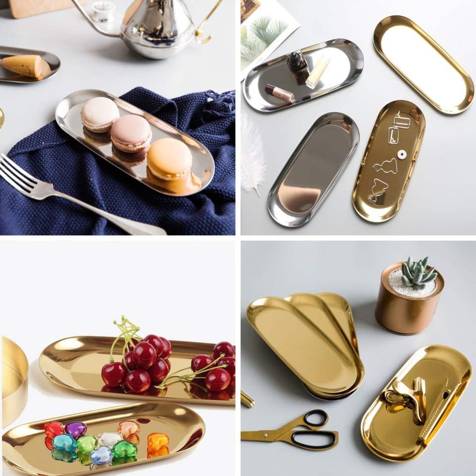 Bandeja Ovalada Dorada para Joyas y Baratijas, Organizador Decorativo Dorado para Baño, Plato Pequeño Dorado para Servir