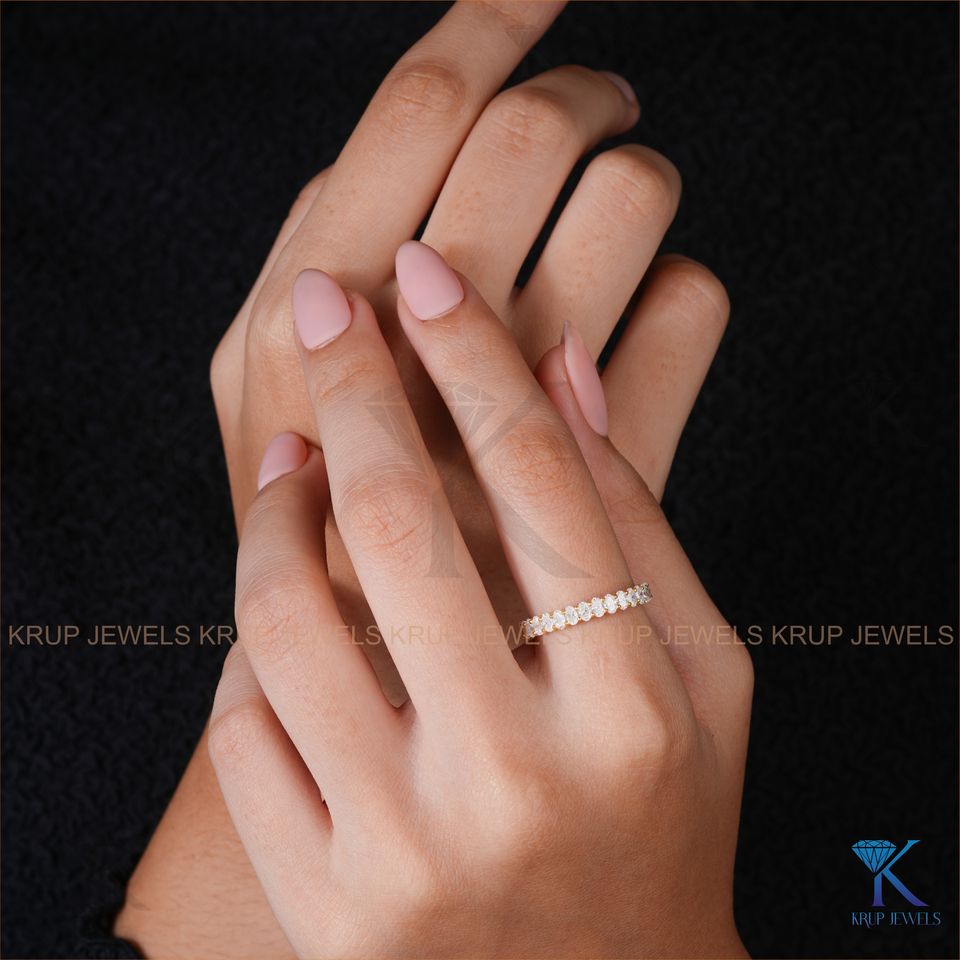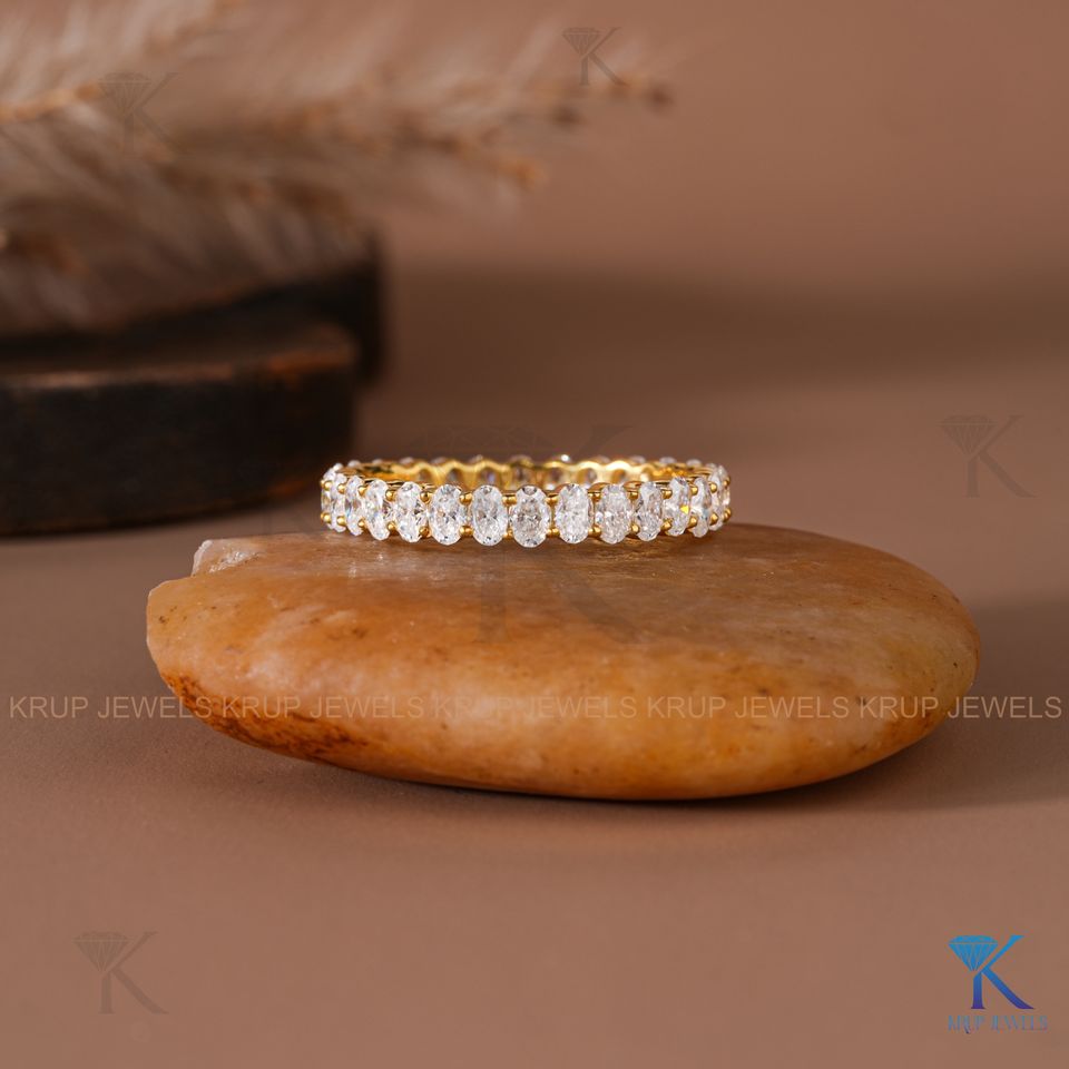 Anillo de eternidad completo con diamantes ovalados cultivados en laboratorio, oro amarillo macizo de 14K, engaste de púas norte-sur, anillos de boda apilables para mujer