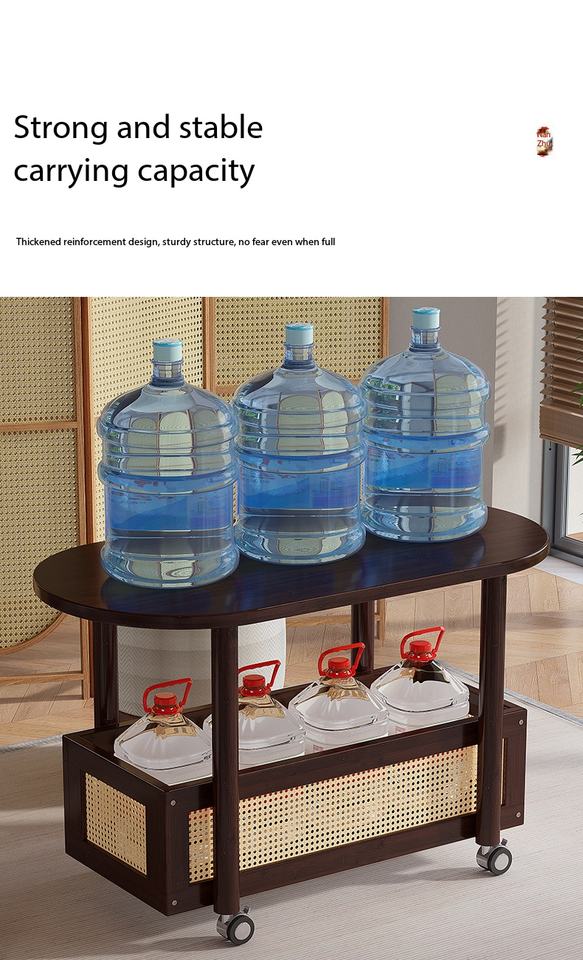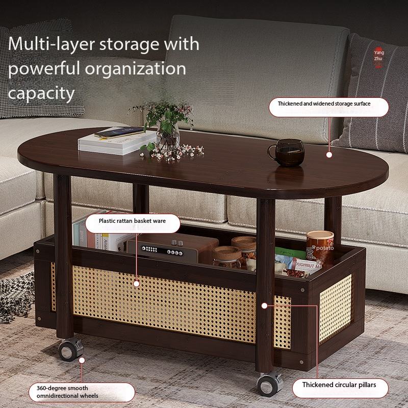 Mesa de Centro Ovalada Móvil con Almacenamiento de Ratán, Mesa Auxiliar Rodante de Bambú para Sala de Estar, Dormitorio, Oficina, Barra de Té, Balcón, Patio
