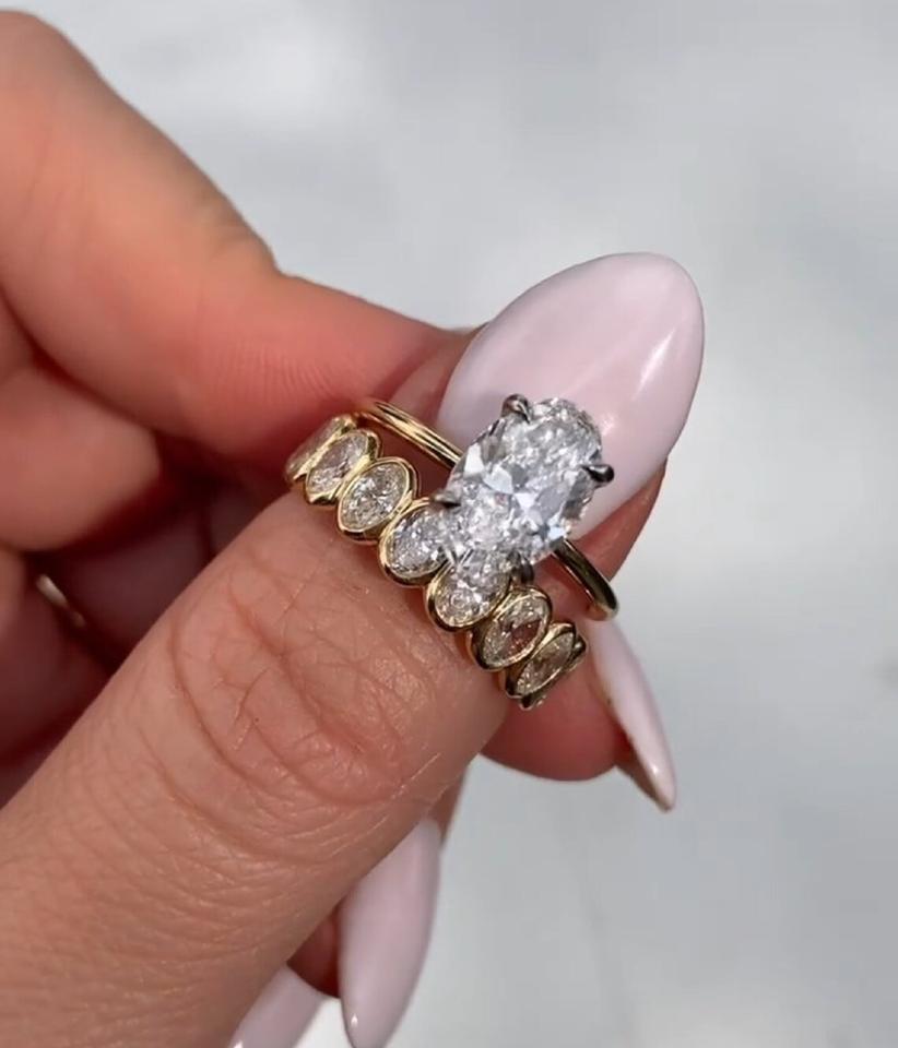 Anillo de Diamante Moissanita Original de Corte Ovalado de 2.50 CTW Chapado en Oro Amarillo de 14K con Engaste de Bisel y Media Eternidad para Boda