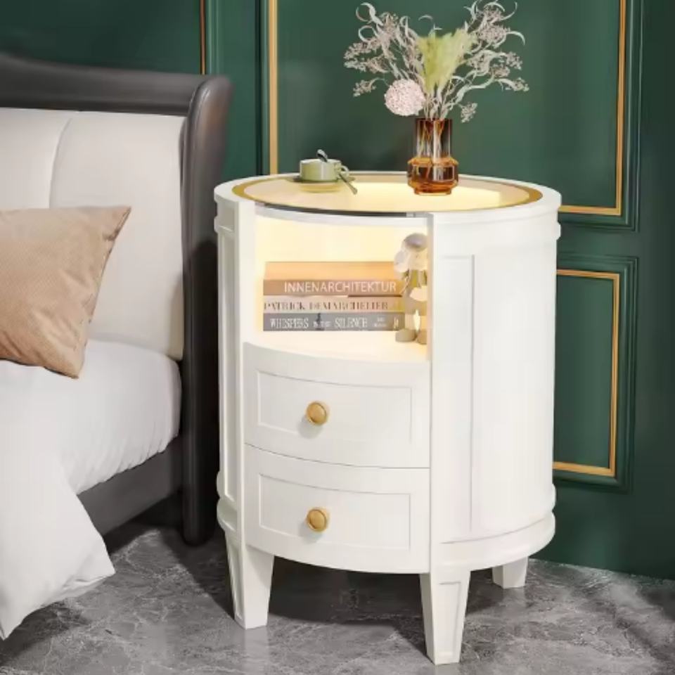 Nombre del producto:Mesita de noche ovalada con 2 cajones y luz LED
