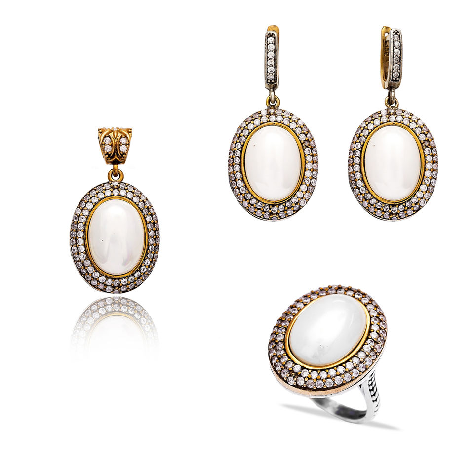 Conjunto de Joyería para Mujer en Plata de Ley 925 Chapada en Oro, Diseño Ovalado con Circonita, Auténtica Artesanía Turca, Moderna para Fiestas