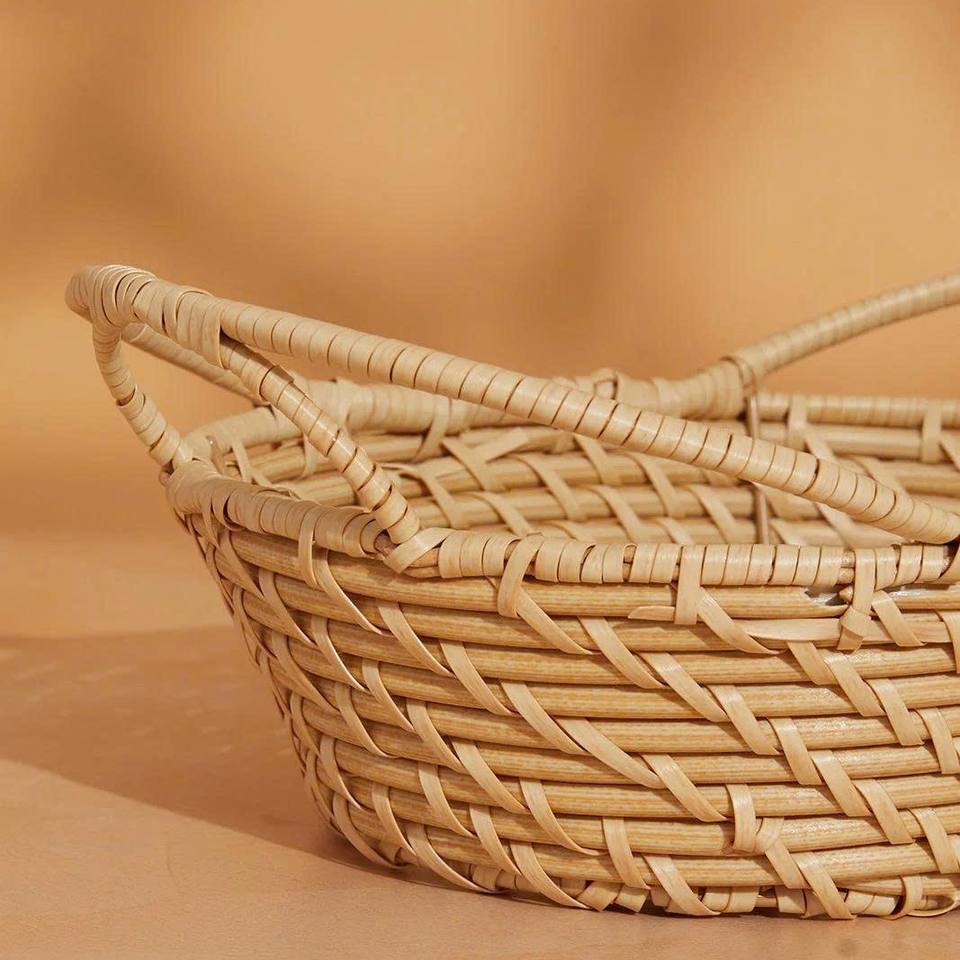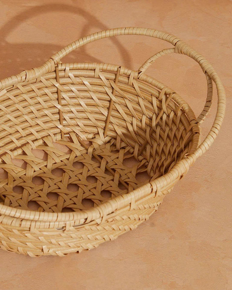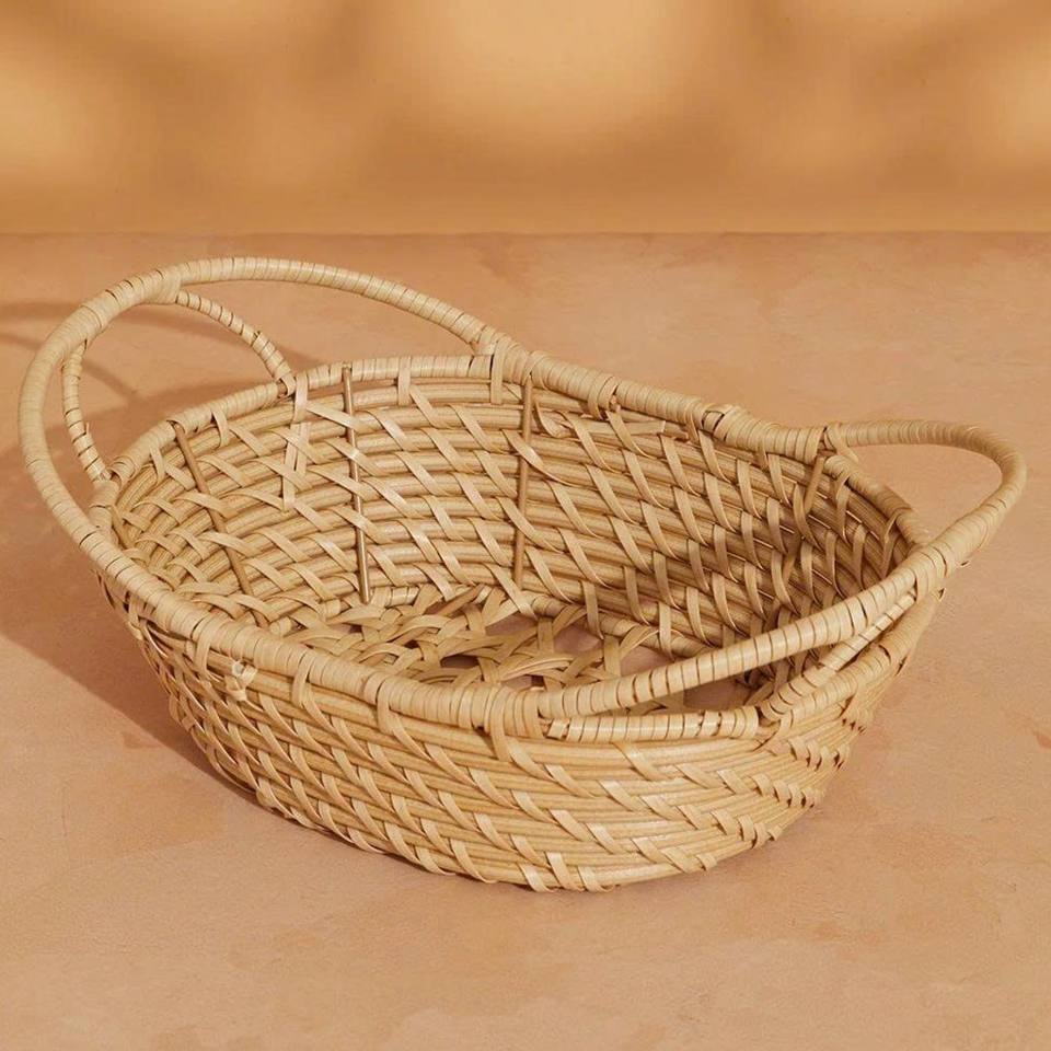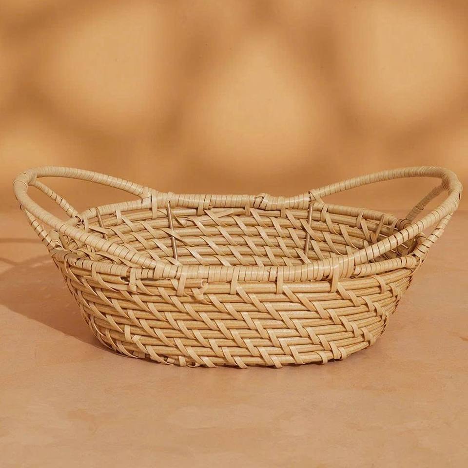 Bandeja ovalada de mimbre con asas para servir alimentos, bebidas y organizar el hogar.