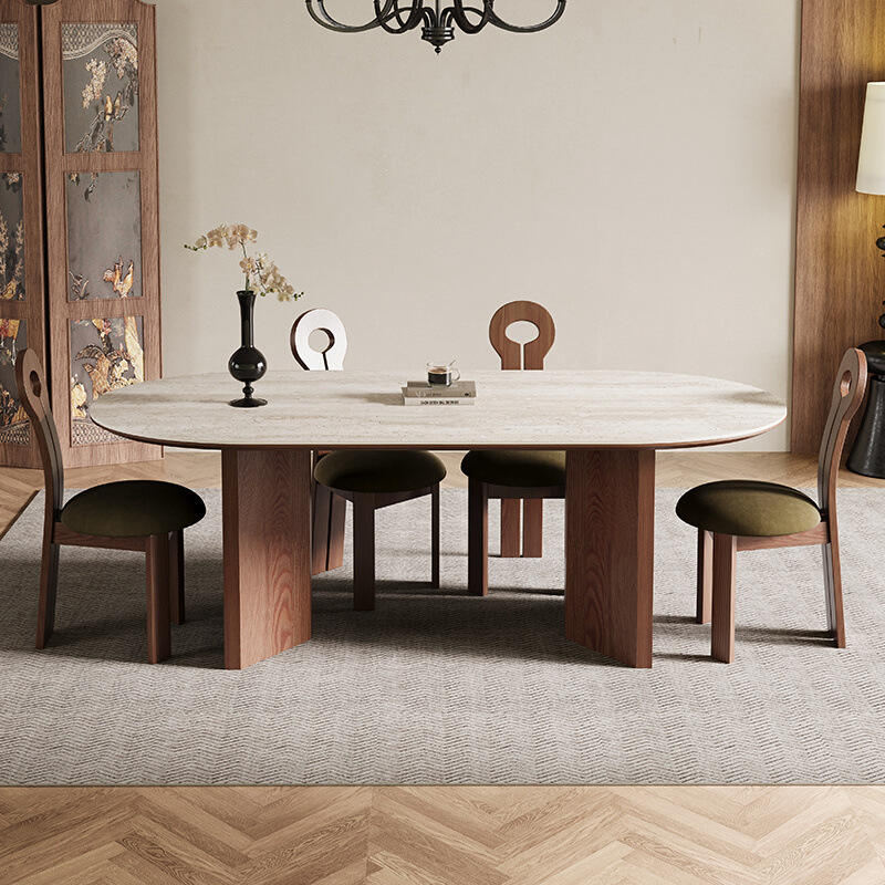 Juego de mesa de comedor ovalada de travertino y sillas, 6 piezas, muebles de comedor de madera maciza de nogal, estructura de caja resistente.
