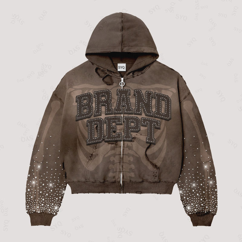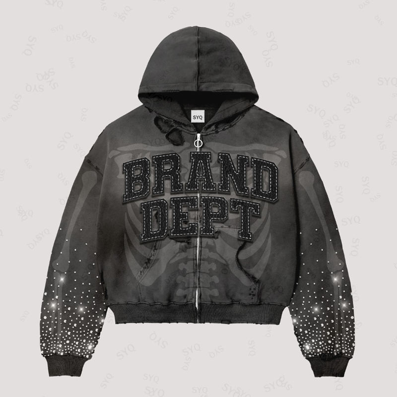 Sudadera con Capucha Extra Grande de Algodón con Cierre, Estilo Urbano, con Bordado, Acabado Desteñido y Pedrería Brillante