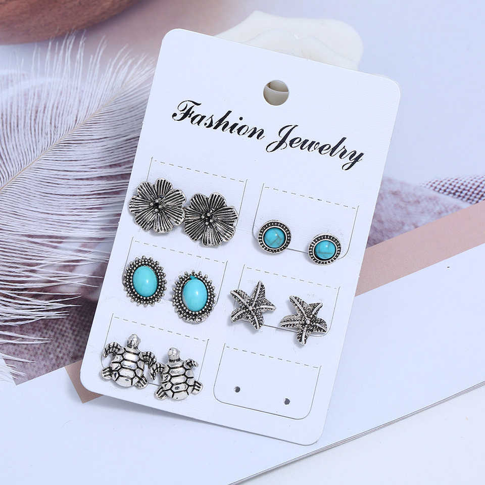 Pendientes de Plata Oxidada y Turquesa con Incrustaciones de Flores, 5 Pares de Aretes con Diseño Inspirado en la Playa