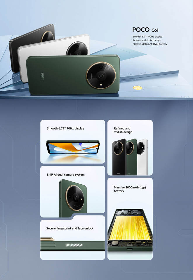 Teléfono Inteligente P0C0 C61 4+128G Verde, Octa Core MTK Dimensity, Pantalla HD de 90Hz, Android 14, LTE, Carga Rápida, Compatible con Francés y Español