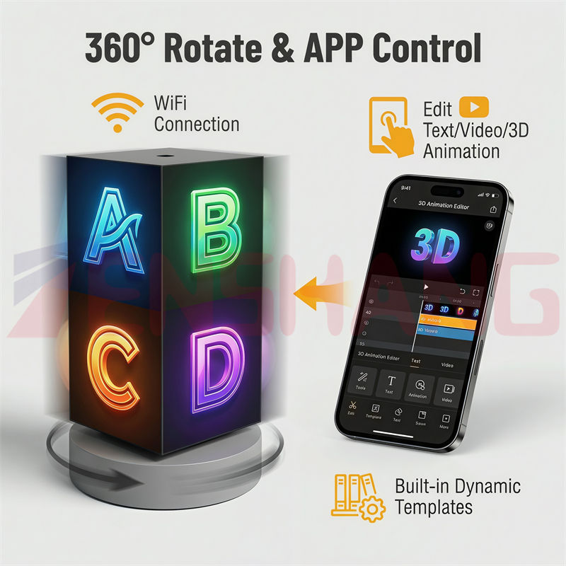 Módulo LED GOB P1.25, Logotipo 3D, Señalización Digital 360 ° Exhibidor LED Cúbico Giratorio de 4 Lados con Batería para Publicidad en Tiendas