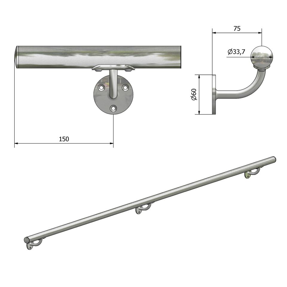 Pasamanos de pared con acabado satinado AISI 304 de acero inoxidable de 33,7 \ "de diámetro con 4 soportes de hierro de 3,00 Mt de longitud para barandillas de balcón