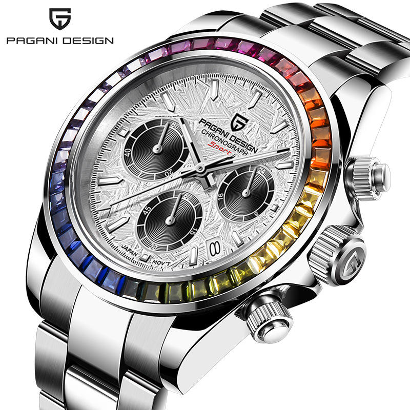 PAGANIDESIGN Reloj de Cuarzo para Hombre Multifunción Cronógrafo Acero Inoxidable Resistente al Agua Colorido Diamante Reloj para Hombre