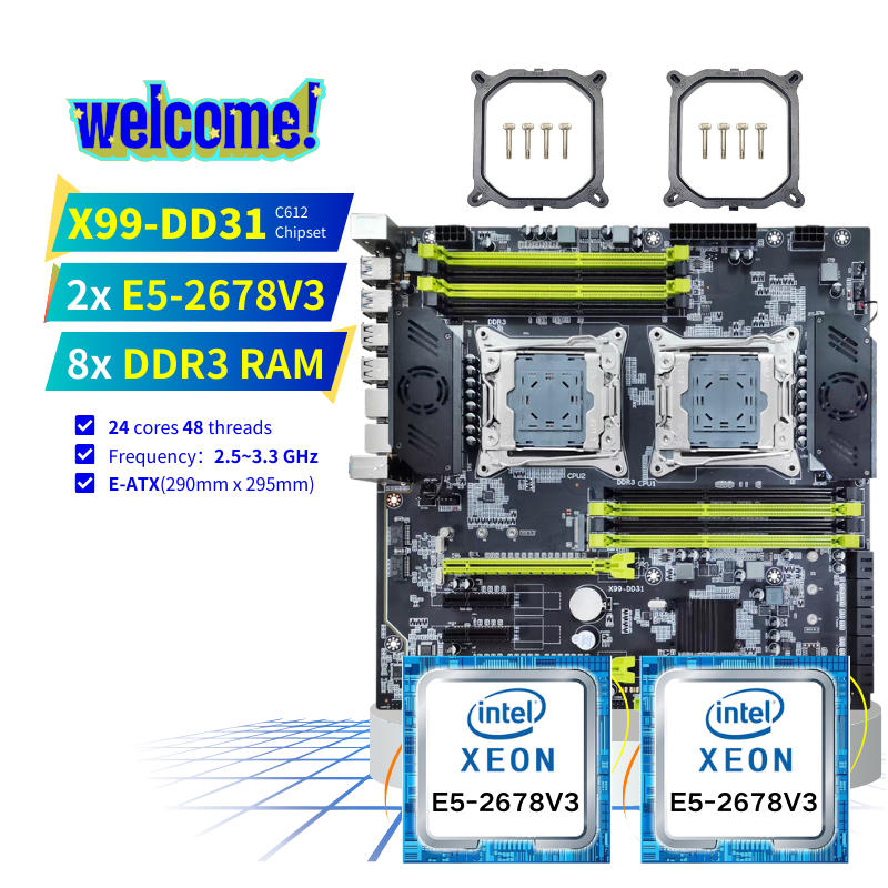 Kit de PC PANDL NUEVO E-ATX X99-DD31 con Refrigeración Activa, Placa Base X99, Combo Dual Intel Xeon E5 2678 V3, 8X DDR3, Placa Base X99 de Doble CPU