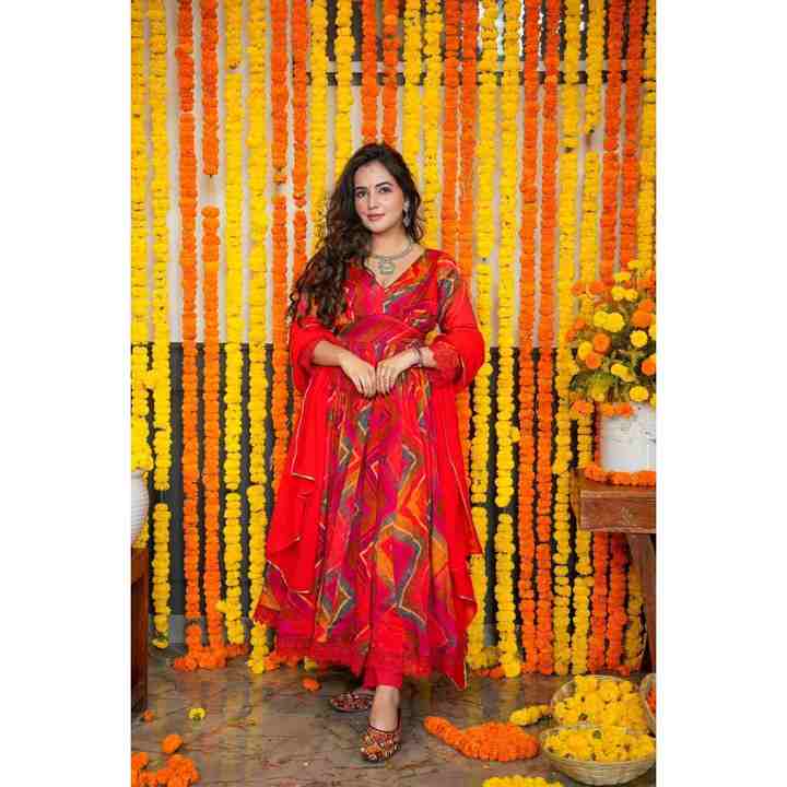 VESTIDO DE FIESTA CHIFFON ESTAMPADO DIGITAL TRABAJO FONDO CON DUPATTA ROJO